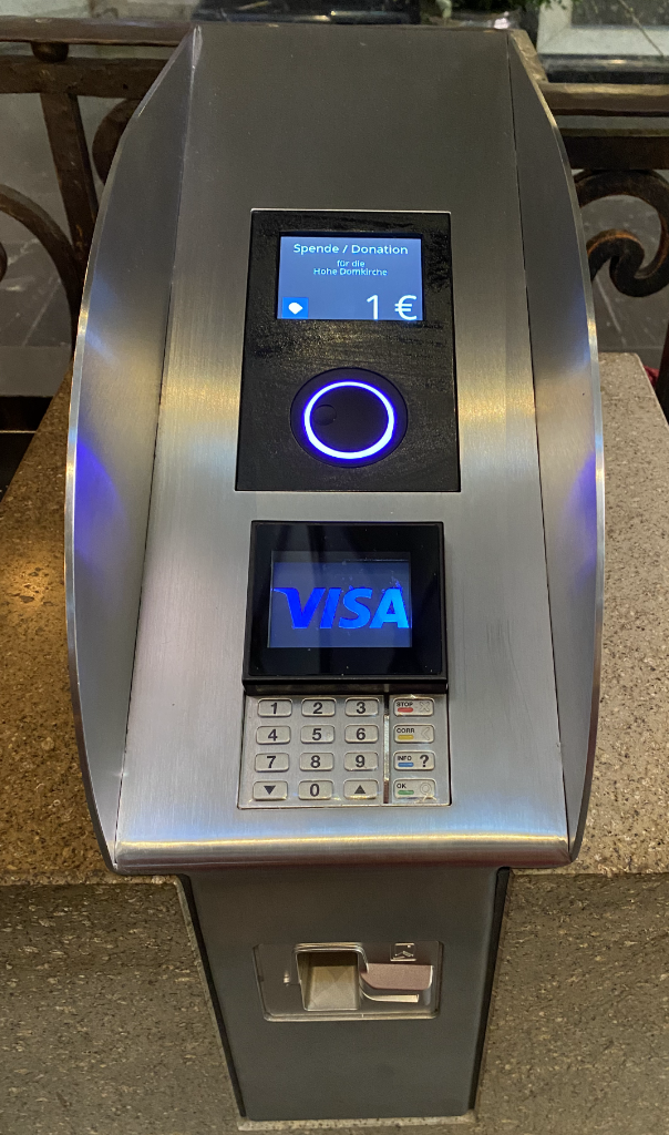 Heute, kaum einer hat noch Bargeld und wer wirft schon seine Kreditkarte ins Spendenkörbchen. Und jetzt, auch hier ist natürlich eine bargeldlose Zahlung möglich. Den Betrag ab 1€ bis zu stolzen 999€ alles ist möglich und die alten Hosenknöpfe haben hier leider ausgedient.